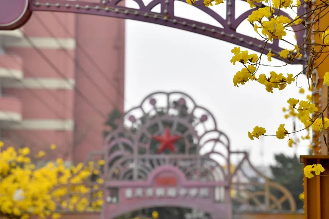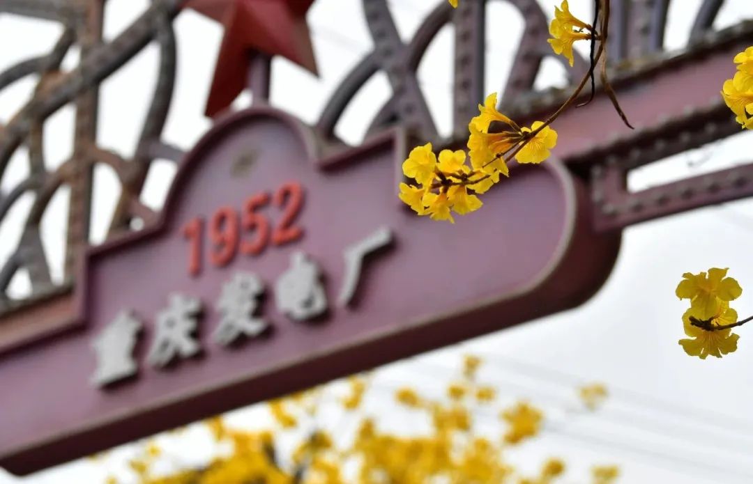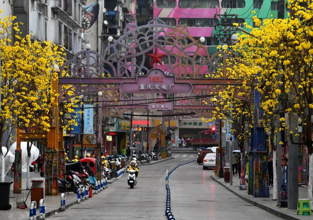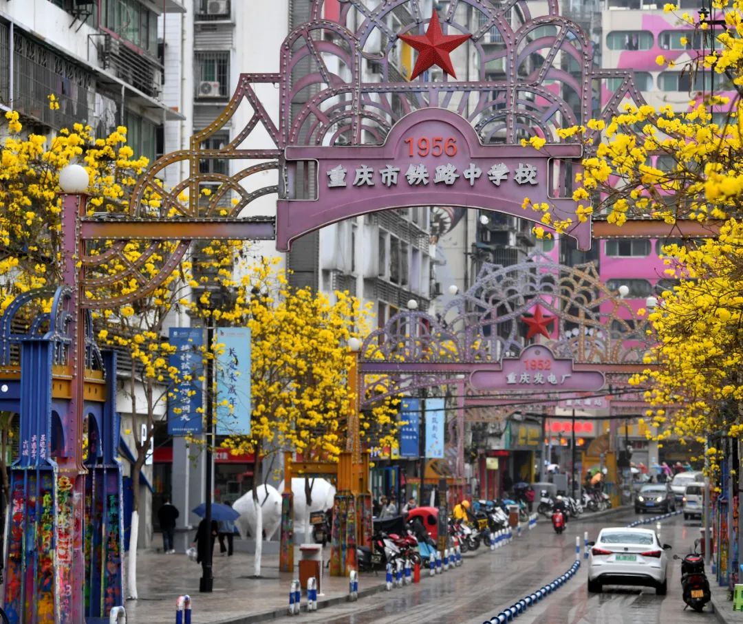 一树黄花醉人眼微风轻抚送春来近日在春意盎然的九龙坡黄桷坪邮电路黄花风铃木灿烂绽放花朵与两侧的涂鸦街相映成趣形成一条近500米长的“金色大道”
