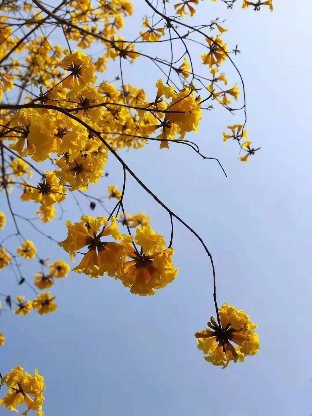 黄花风铃木因花型似风铃状花色金黄而得名开花时只见花而不见叶团团簇簇的黄花远望如“黄金甲”般满溢眼眸又如同童话世界般迷人行人走进街道盛开的花朵愈加迷人