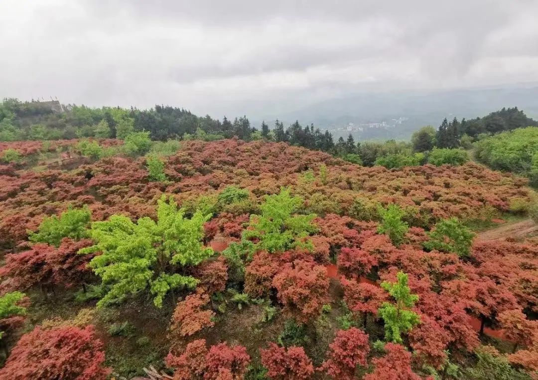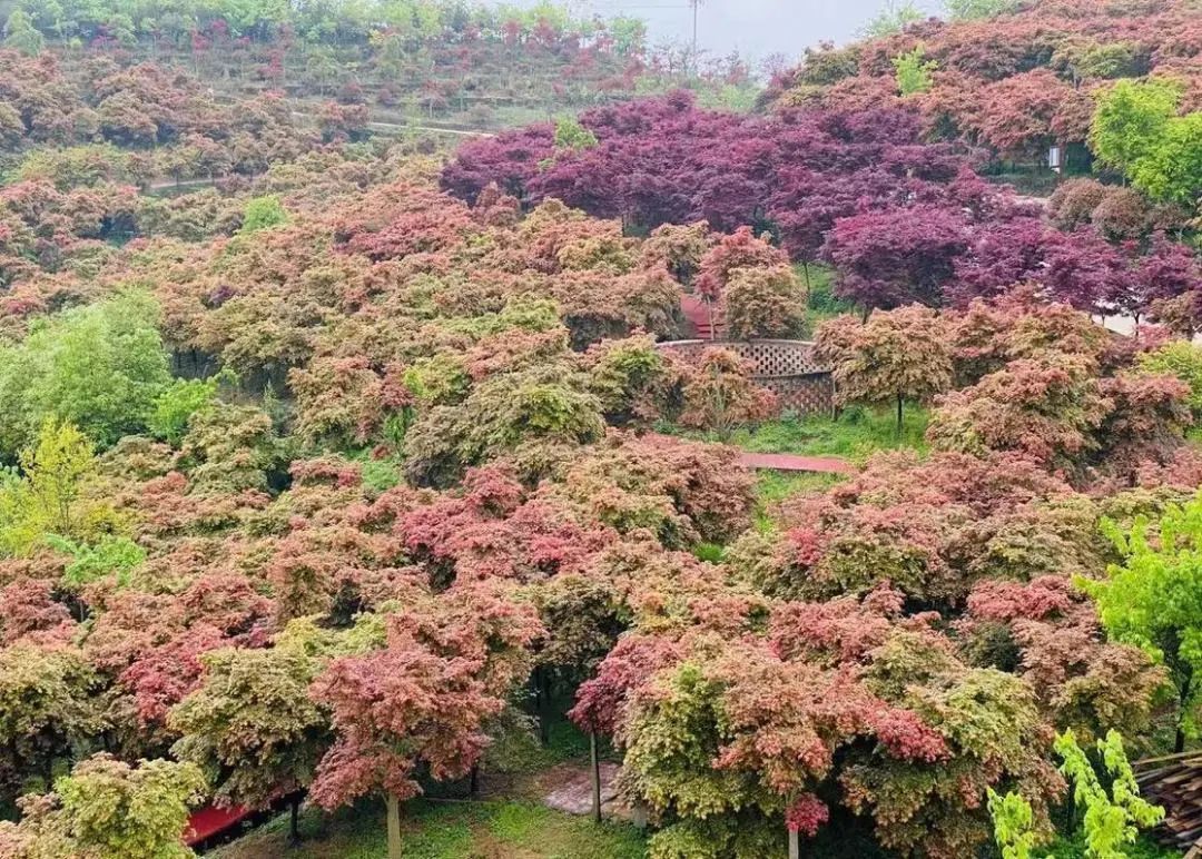 这片红枫林在安澜镇距离兰海高速一品下道口9公里园内种植有各类红枫2.5万余株正悄悄红遍山头