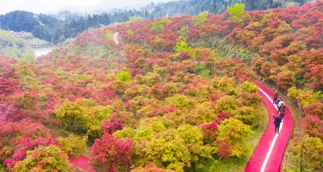 每到春天枫叶就会染红山头红枫林里一片深红、猩红、桃红千叶万树,层次分明,色彩纷呈
