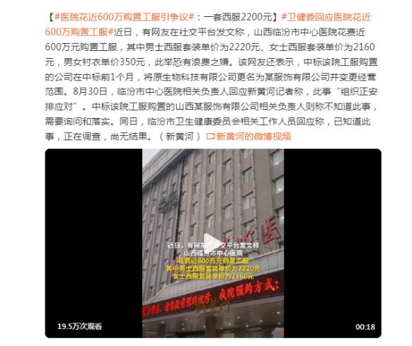 临汾市卫生健康委员会相关工作人员回应称,已经知道此事,正在调查,但目前尚无结果。对于此事网友们纷纷发表自己的看法和观点。有些人认为,医院此举确实存在浪费行为,应该加而强另监一管些和人审则查认为医院购置高质量的工服可以提高员工的工作积极性和医疗服务水平,而且中标公司变更经营范围也与医院采购行为无关,因此不应该过分批评和指责。