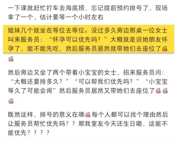 自己在海底捞排队等位时,遇到服务员优先安排孕妇,引起广泛关注。 图/梨视频 很多网友认为此举不妥,大家都是来吃饭的,孕妇不应该有优先权。“凭什么孕妇就能插队?”“孕妇也得等着,...