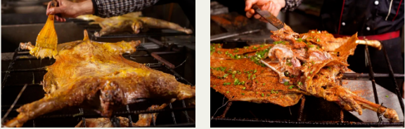 统景温泉烤全羊选自原生态散养山羊,肉质细嫩,味道鲜美。初烤、划刀、上油、刷酱、上料......随着不断跳动的火焰侵渗,羊肉的表皮也渐渐变得紧实焦脆,且最大程度保留了原滋原味和羊肉本身所具有的营养成分。