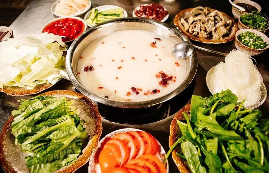 正宗的烤全羊吃法讲究“原汤化原食” 吃完羊肉还有鲜美的羊肉汤锅,嚼劲十足的羊杂配上特色蘸料,香味的融合充斥味蕾,让人欲罢不能。