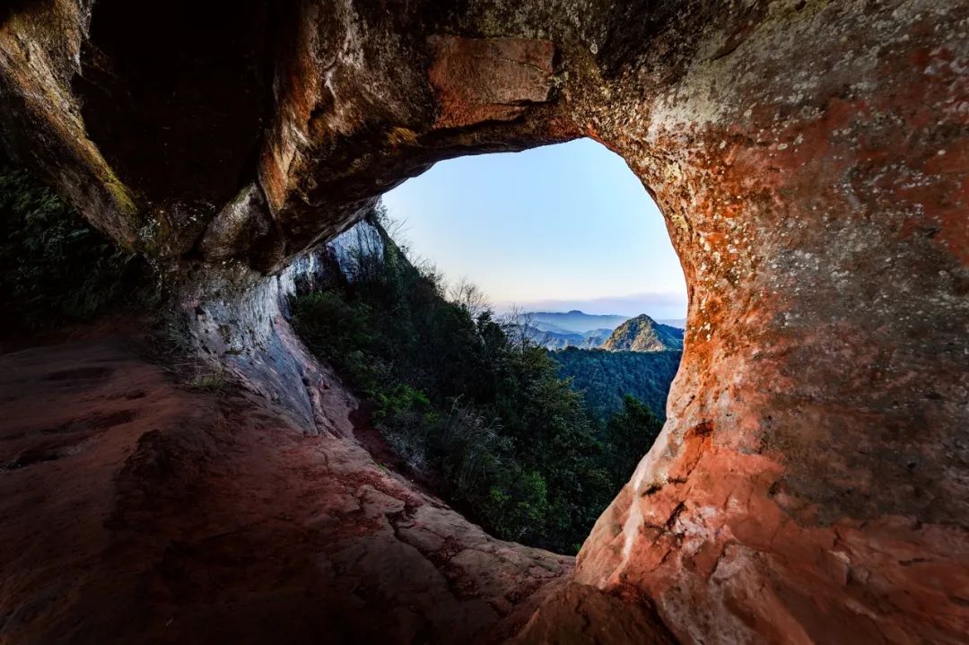 在四屏镇插旗山顶西北200米处,海拔1300米,有一个天生的对穿对过的大山洞,宽约10米,高约5米,被当地人叫做“穿洞岩”。游客能通过洞口望到蓝天,“天空之眼”由此得名。
