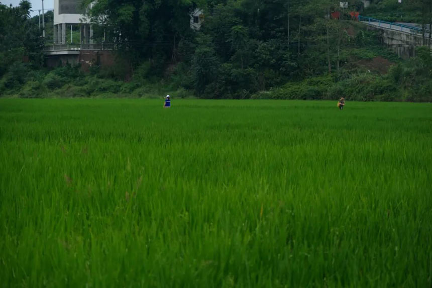 成片农田里,稻浪滚滚 绿油油的千亩稻田铺在村落房屋间 形成丰收的海洋 线条阡陌纵横 与两旁农舍的白墙乌瓦 构成了一幅醉人的田园风情画卷 充满勃勃生机