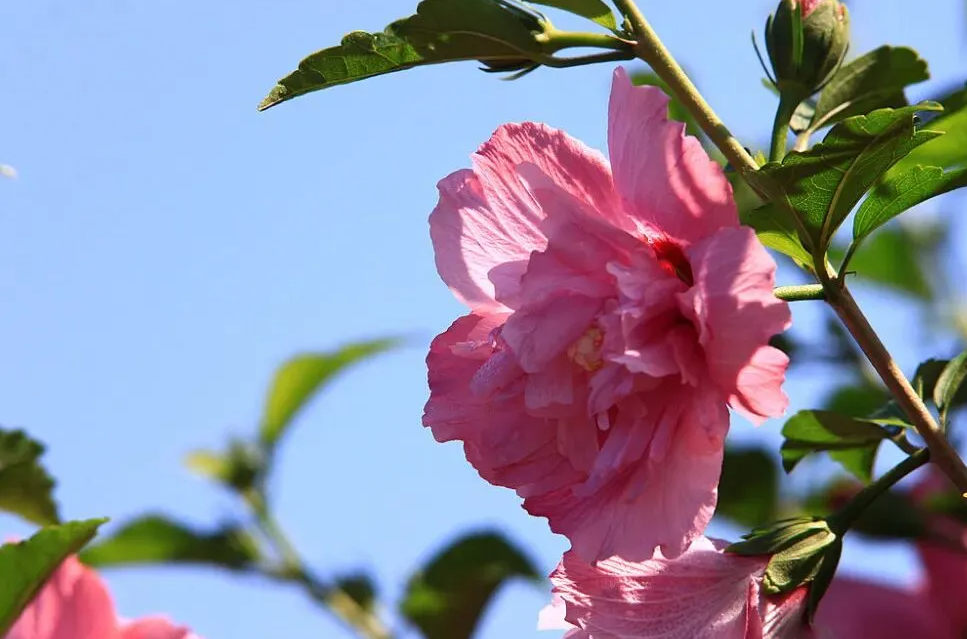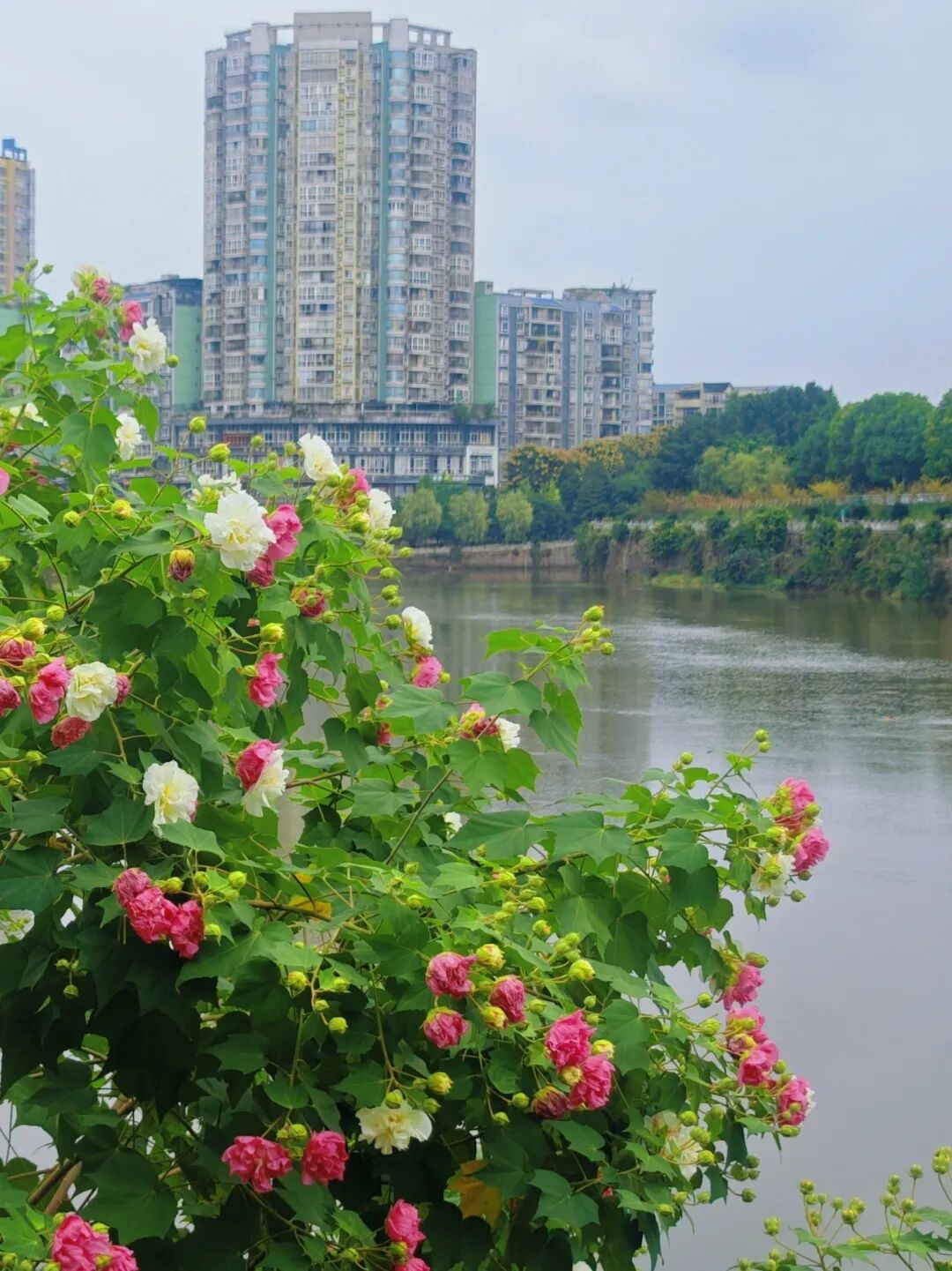 在这片免费开放的城市秘境里芙蓉花沿河岸肆意生长野趣十足清晨花苞缓缓绽放花瓣通透如白玉午后阳光渐暖花瓣又像被染上了胭脂傍晚时分又摇身一变醉成迷人的深红如夕阳下燃烧的红霞美得令人心动