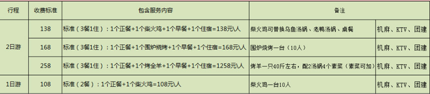 套餐一、2日游 138 标准(3餐1住):1个正餐+1个柴火鸡+1个早餐+1个住宿=138元人 柴火鸡可替换乌鱼汤锅、老鸭汤锅、桌餐 机麻、KTV、团建