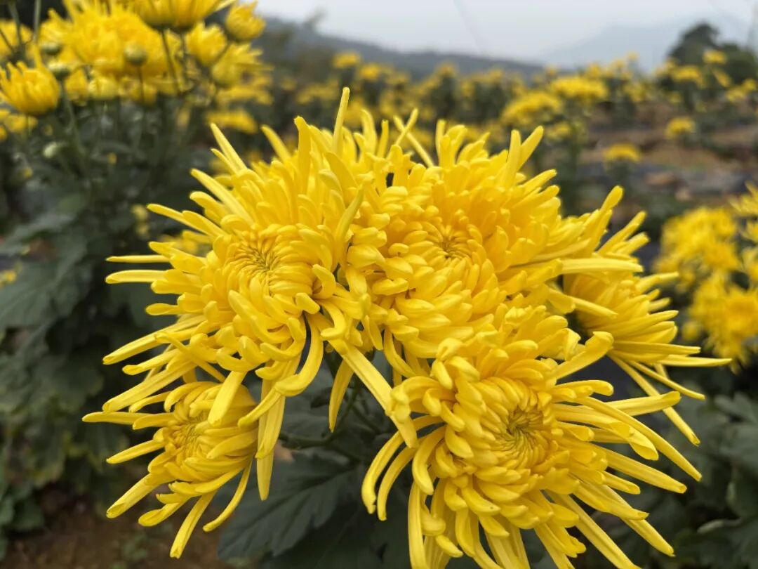 11月初的南桐镇王家坝村, 正是千亩菊花盛放的绝佳时节。 金黄的菊花在田间铺展成金色的海洋, 微风拂过,菊香四溢, 尽显“采菊东篱下”的悠然意境。