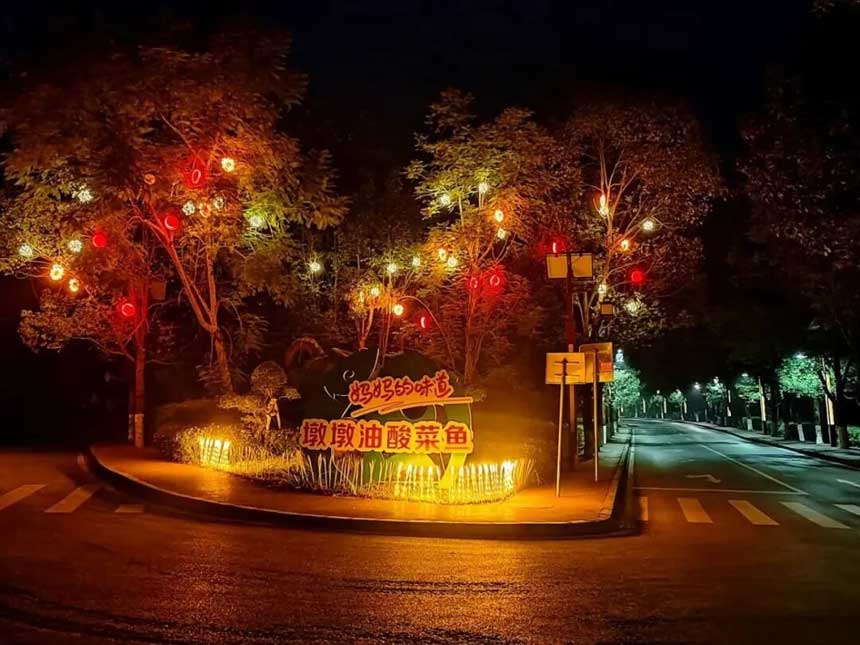 此次迎春灯饰以灯笼、中国结、福球灯、流星等挂件为主,额外加入了“墩墩油酸菜鱼”“温泉嘉年华”等特色灯光,将东温泉镇装点得格外喜庆祥和。