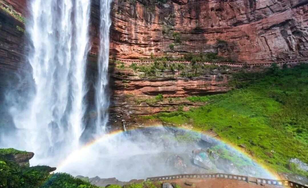 除了气势磅礴的瀑布景观 更不能错过的就是 那条横穿瀑布的粉色栈道 站在栈道上,瀑布从面前倾泻而下