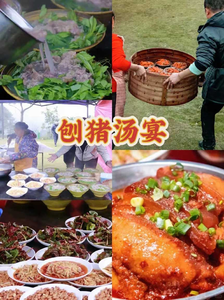 现场看师傅处理年猪(胆小勿近hhh),但之后的全猪宴真的香迷糊了!血旺汤、回锅肉、炒猪肝…土灶烧出来的就是不一样‼️