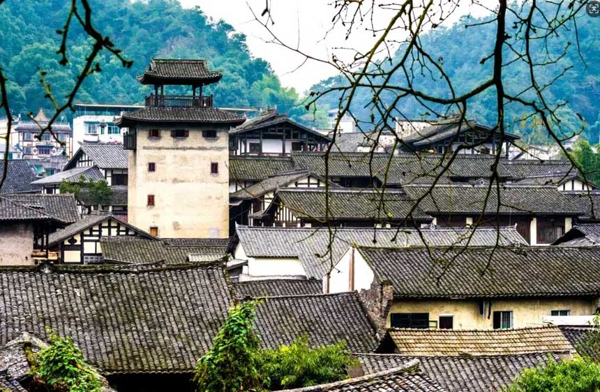 古镇空间结构为回字街 拥有国内保存最好的“川渝式”碉楼群 (辖区内现有碉楼15座) 仁寿茶馆、禹王宫、十全堂等系列古建筑 两侧民房均为2~3层全木质穿斗结构 多为青砖黑瓦四合院 是典型的徽派特征