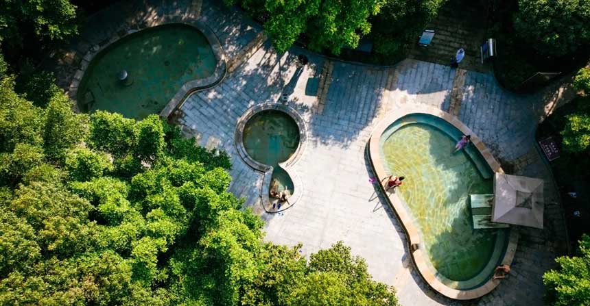 它背靠中梁山山脉 温泉涌流于中梁山脉末端地下2500米深处 有苍松翠竹,小桥流水 冬日泡汤不仅能驱寒暖身 还能舒缓疲惫,温润解乏