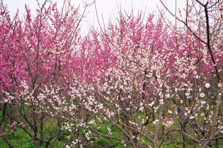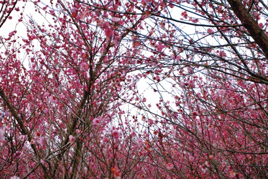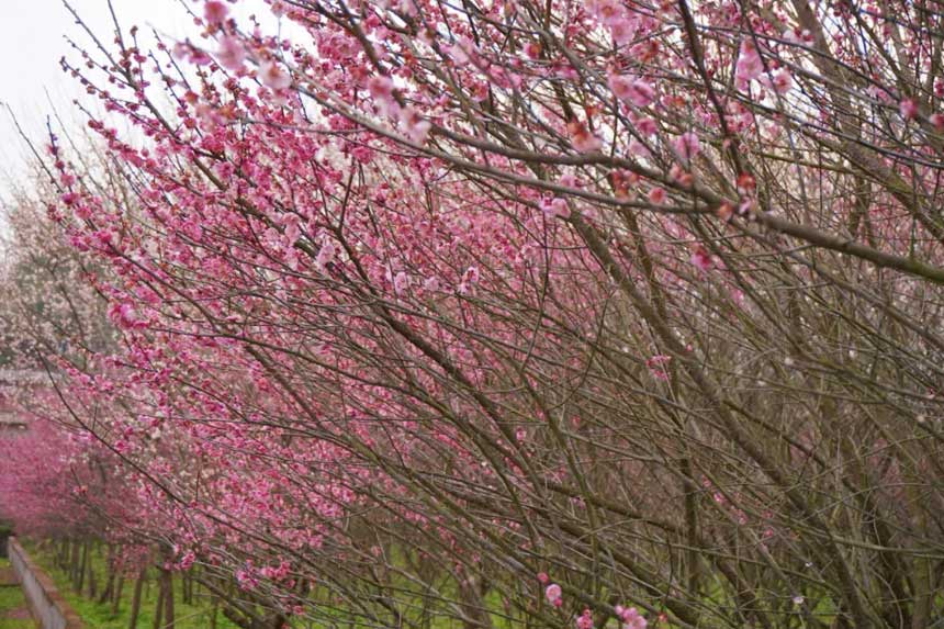 红梅谷占地面积约200余亩 以美人梅、宫粉梅为主要品种 花色红粉交织 花期预计从1月下旬 持续至2月中下旬