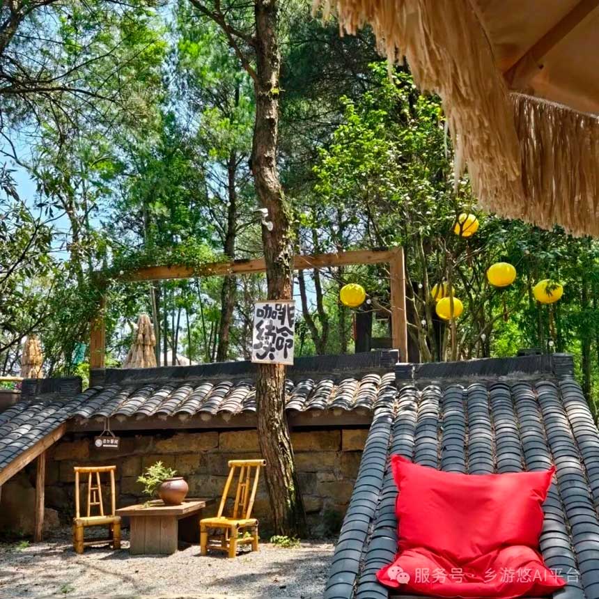 玉峰山褶皱里,乐胜山里民宿蜷成枚绿螺。石阶洇着苔痕,木窗漏进松风,炊烟与云絮缠吻。星子落瓦时,山月正舔舐檐角的铜铃。