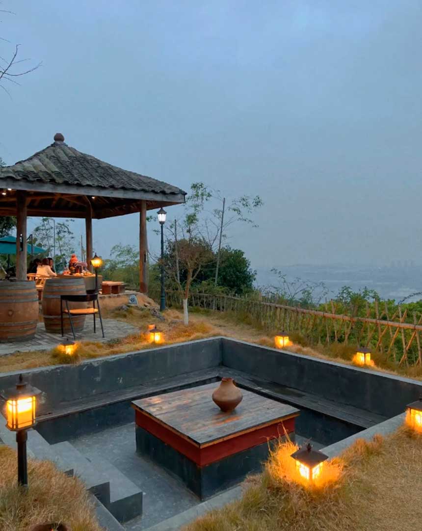暖黄光晕漫过玻璃幕墙,蔷薇影与远山叠印其上。茶盏轻磕处,抬头忽见渝州城池的灯海,正在脚下幽谷间无声翻涌。花影浮沉间,一席山肴竟尝出星垂平野的况味——原来所谓闲情,不过是就着半盏山茶,把整座春山咽下。