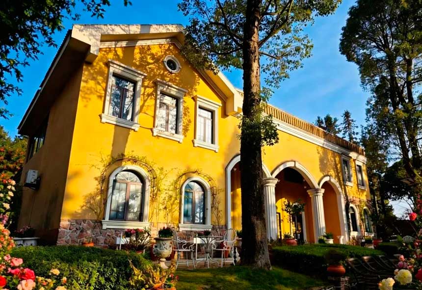主城驱车一小时,我们把南法的日光与浪漫,藏进了樵坪的万亩森海里。奶黄色的法式小楼,拱窗爬着藤蔓,门前的草坪缀满鲜花。阳光斜斜洒下,树影在墙面上织就温柔的纹路,像极了南法乡村里,不被打扰的私家庄园。