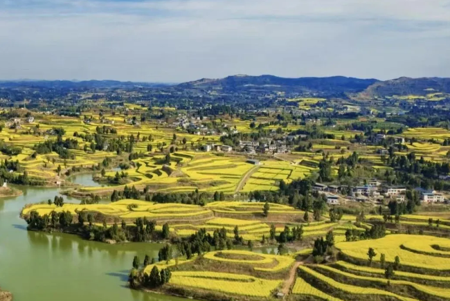 涪江的水面上,几艘画舫慢悠悠地划过,船桨搅动着春水,也搅动了一整个春天的温柔。远处的青黛山峦,近处的粉墙黛瓦,再配上这铺天盖地的金黄,真应了那句诗:“满目金黄香百里,一方春色醉千山。”