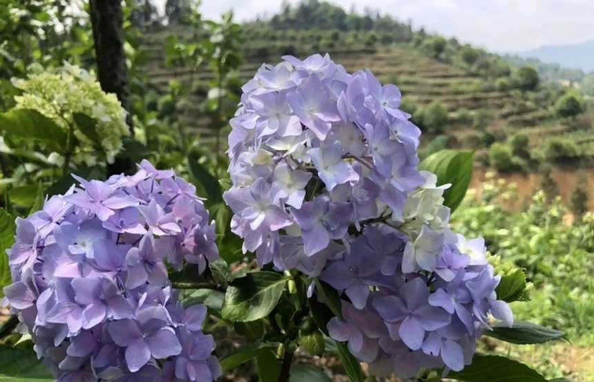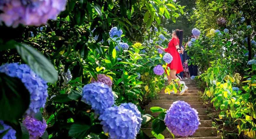 走进接龙镇的百里山林,这里的绣球争奇斗艳,竞相盛放,把山林染成了姹紫嫣红的模样。