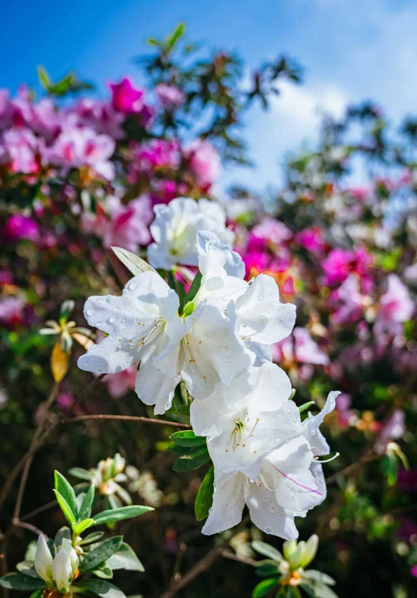 这里的杜鹃从不挑天气。晴天时,阳光为花瓣镀上一层金边,色彩浓郁得化不开;雨后,花朵被洗去浮尘,晶莹的水珠在花蕊颤动,更显空灵柔美,娇艳欲滴。