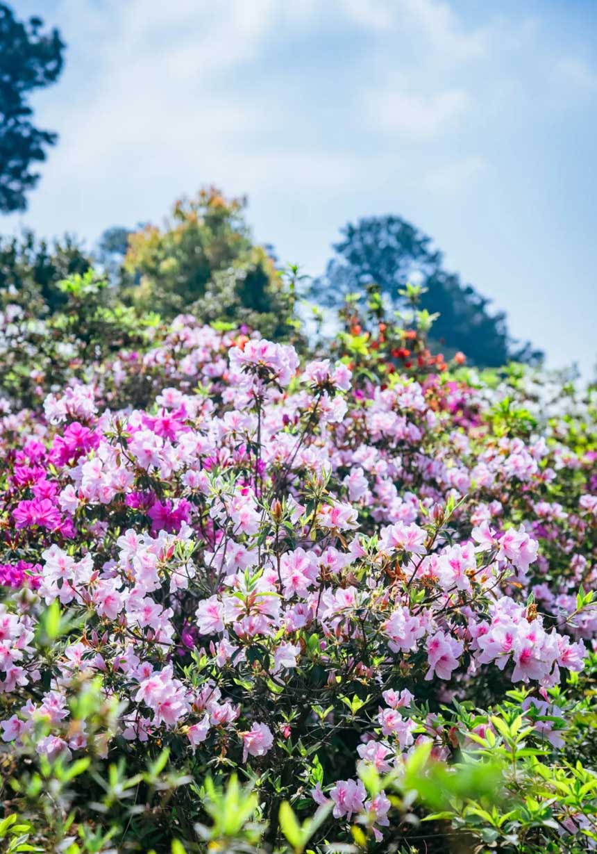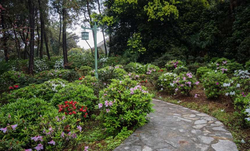 依山而建的杜鹃园,5万多株杜鹃随山势高低错落。沿着曲折往复的石板小径拾级而上,花影迷离,草木繁茂,仿佛误入了童话里的爱丽丝仙境。