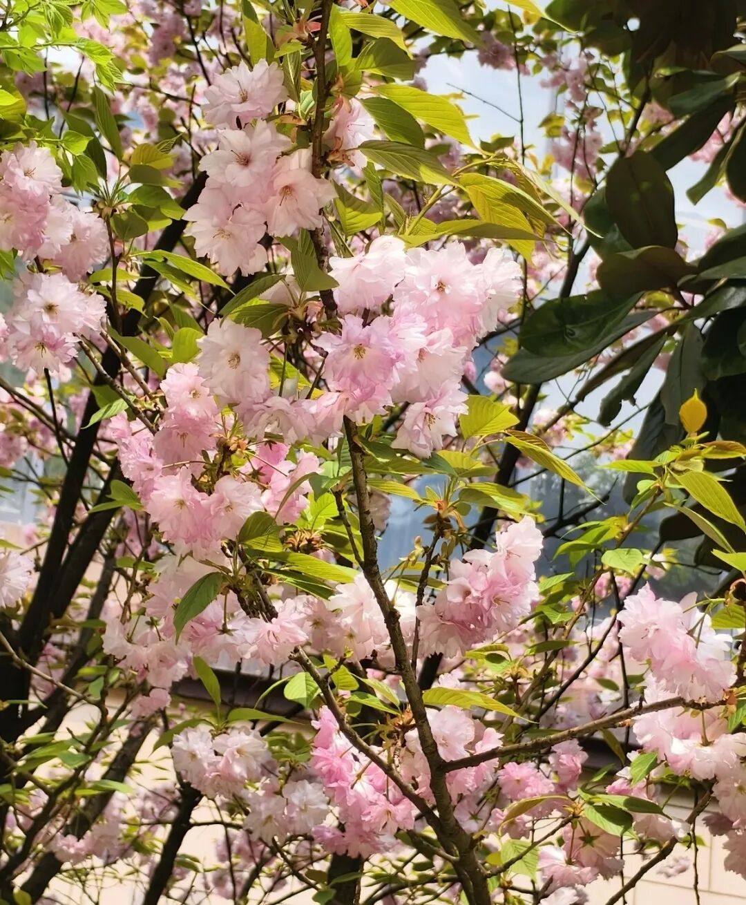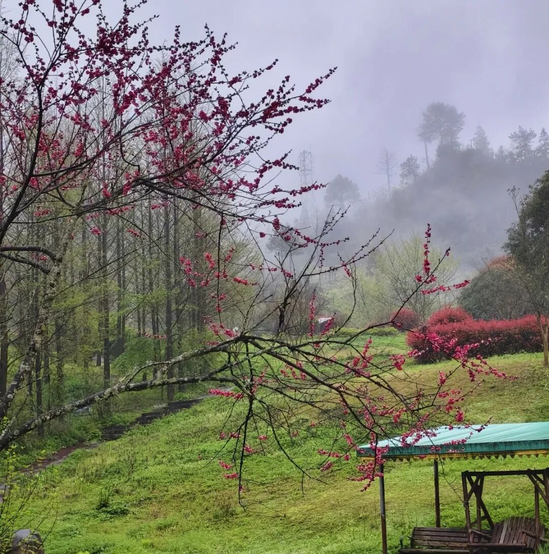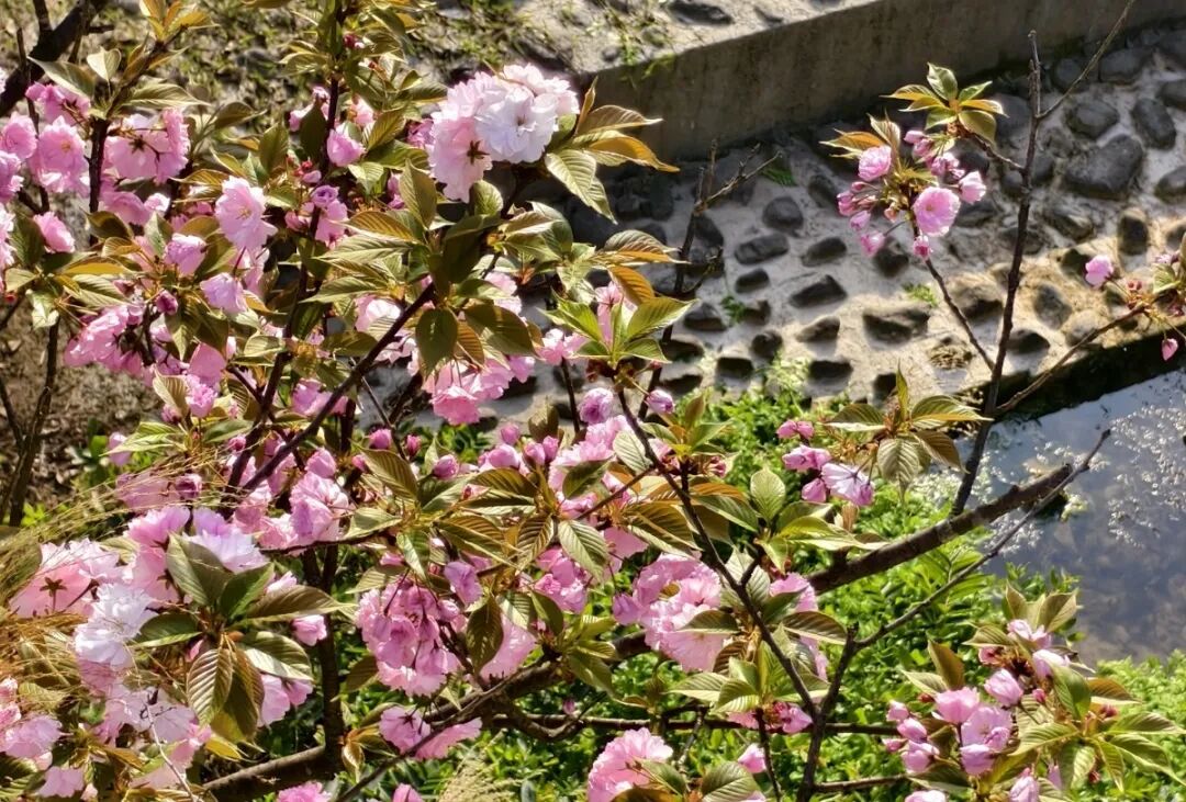 待到四月,粉色樱花接踵而至。浅浅的粉,漫山遍野地铺开,仿佛整个山谷都笼在一层薄薄的春雾里,美得像一场不愿醒来的梦。