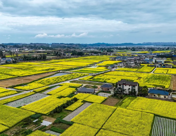 从潼南城区出发,沿着滨江路往三块石电站方向行驶,不过20分钟车程,车窗外的风景就从城市楼宇切换成了连片的金黄。当无人机缓缓升空,眼前的景象更是让人瞬间失语:千亩油菜花顺着田埂铺展,像被春风熨平的金色绒毯,与碧绿的蔬菜基地、澄澈的水塘、白墙黛瓦的农舍交错成画,远处是蜿蜒的潼南运河与连绵的丘陵,天际线尽头还能望见涪江的粼粼波光。