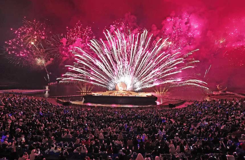 夜晚重庆天空剧院点亮星河,烟花秀、无人机秀浪漫上演,5月1日起常态化运营,夜游湖山,惬意十足。