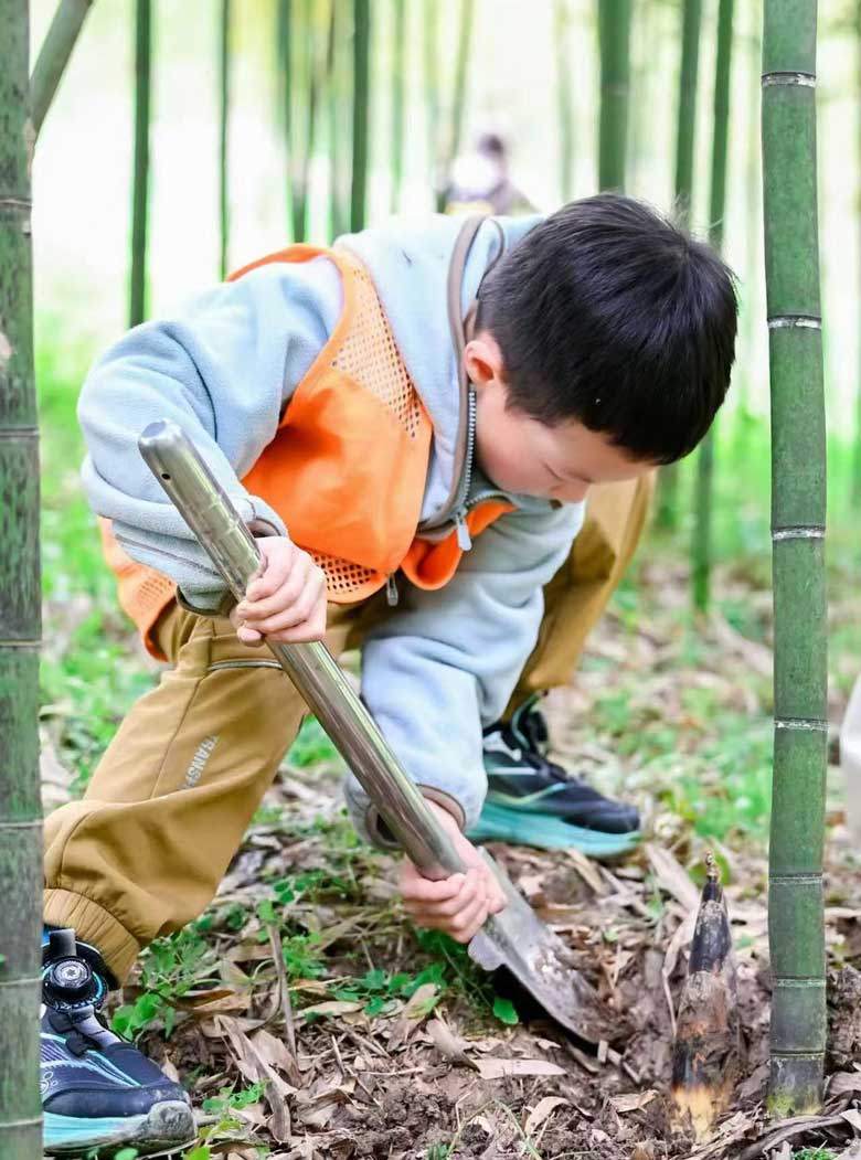 3、山野寻鲜 · 沉浸式挖竹笋 扛起小锄头,走进郁郁葱葱的竹林 在向导的带领下寻找藏在泥土里的春日第一鲜——春笋