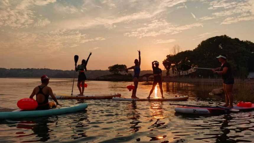 “现在水质变好了,景色也很漂亮,五光十色的,今天水温很合适,一趟训练下来,效果应该会很好。”她一边聊天一边下水,1分钟后,她和伙伴们滑到湖水中央,融入了夕阳下的湖光山色中……