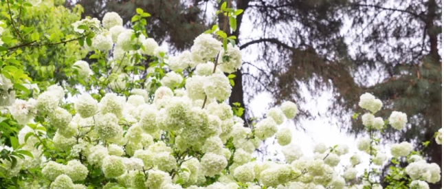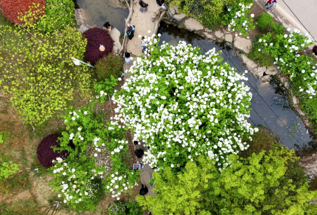 初绽时带着抹茶般的清新绿意 随着花期推进 逐渐晕染成纯净的白色 微风拂过,花球轻轻摇曳 与景区内的小桥流水、木质步道相映成趣 勾勒出一幅灵动的春日画卷