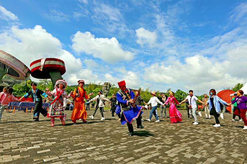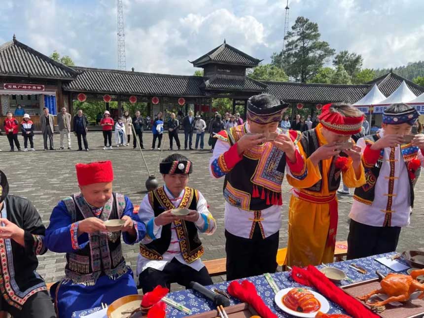 万盛石林景区举办2022年“万盛红苗·石林喜乐”文化展演,展示苗族婚俗、竹竿舞、团结舞等民俗文化活动,丰富市民、游客的假期生活。