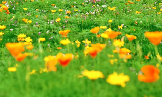 4月正值盛花期 虞美人橙黄的花瓣在风中轻颤 矢车菊蓝紫的花穗摇曳生姿 勿忘我淡蓝的小花点缀其间…… 红、蓝、紫渐变如打翻的调色盘 每一帧都是自带滤镜的油画感