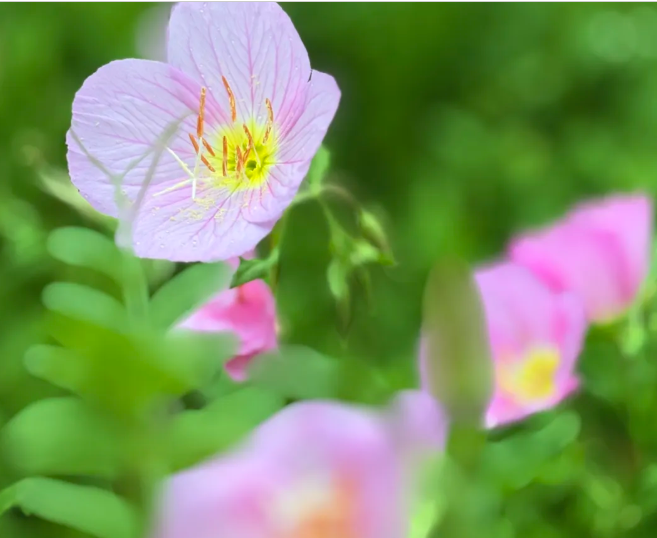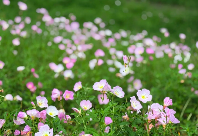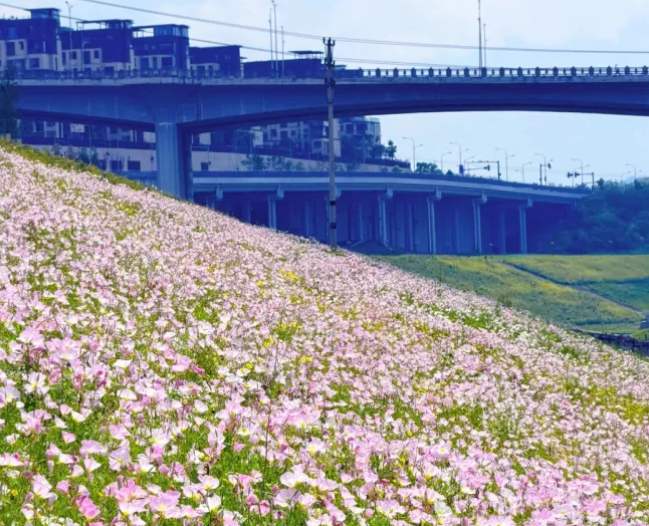 成片的月见草 如繁星坠落凡间 层层叠叠铺满 重庆各大公园的山坡 仿佛给大地披上了 一袭温柔的“粉色绸缎”