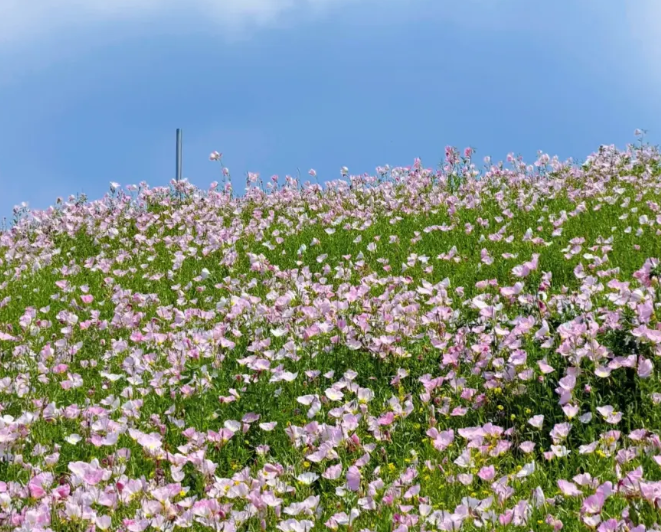 粉白摇曳,暗香浮动 在重庆四月天 「箭滩河公园」月见草花海 藏着春天最含蓄的告白 粉色花朵搭配蓝天白云 无需滤镜,随手一拍 每一张 就是莫奈笔下的油画