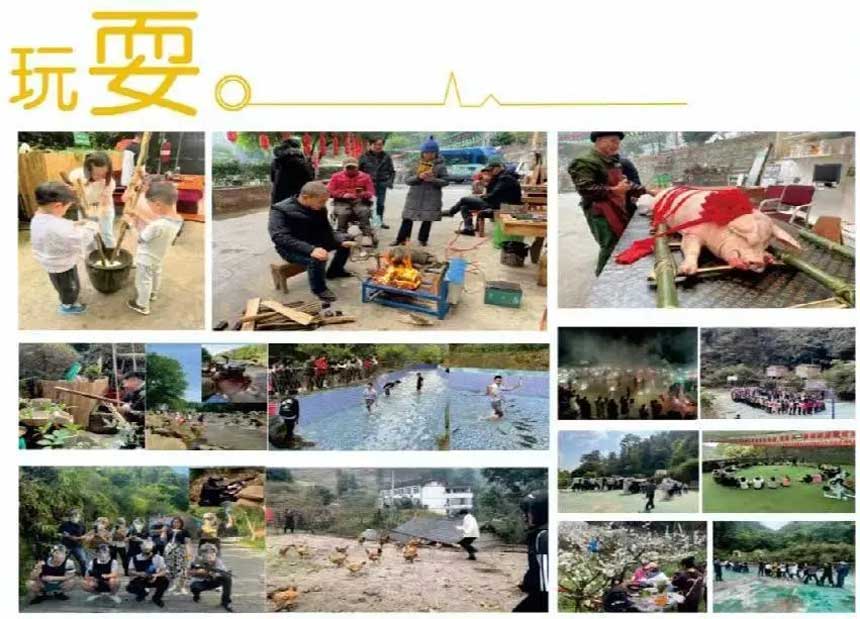 机麻、KTV、汉服拍照、登山健步、DIY竹筒饭、拔河、摸鱼、吊床、摸螃蟹手工打糍粑、会议室、森林寻宝、打爆米花、鸵鸟、孔雀观赏拍照、垂钓、手工石磨豆花、拔竹笋、水果采摘、篝火晚会、真人CS