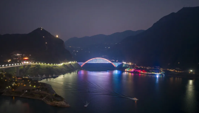 打卡指南:最佳拍摄点在远离城区一侧,靠近大桥红叶山庄,站在这里可完整拍摄大桥全景,复刻影片中大桥开灯的震撼画面。傍晚时分,大桥灯光次第亮起,与江面的倒影交相辉映,既有影片中的时代厚重感,也有巫山夜景的璀璨诗意。