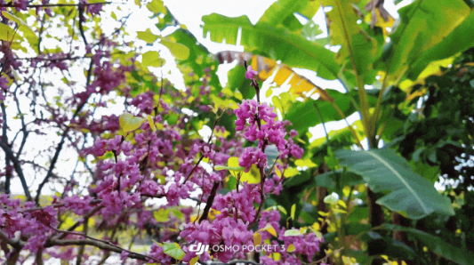园内繁花争艳, 海棠粉白如云、紫荆紫霞满枝、桃花粉嫩娇羞, 三色花海相映成趣。