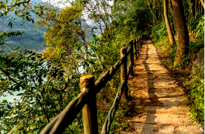 起止点均位于中梁山西麓、观音峡口的东阳街道黄桷树公交站。 该线路爬升和强度较大,主要串起了网红寺庙道明寺、周家凼天坑以及昔日著名的天府煤矿,除享受山林氤氲之气外,还可一睹当年山上繁华的矿业遗迹。返回后可在具有40年历史的车站食店用餐,体验北碚本土饮食文化。
