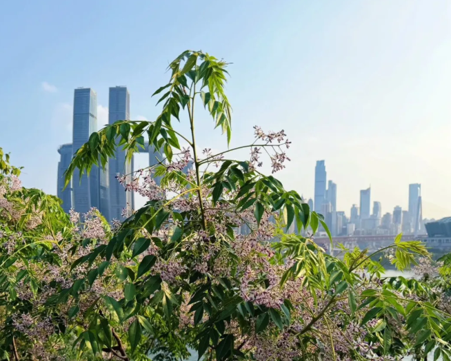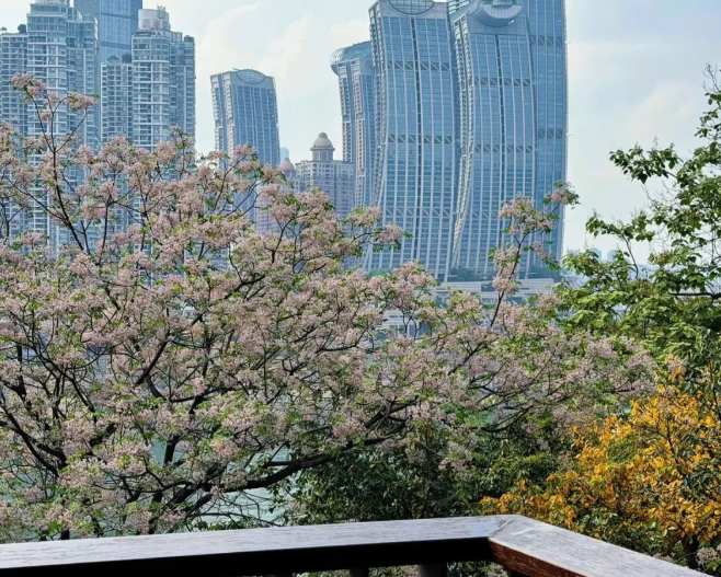 下浩里老街里,苦楝花盛放 阵阵幽香扑面而来 站在老街 可欣赏淡紫色苦楝花 与来福士、东水门长江大桥 同框的景象
