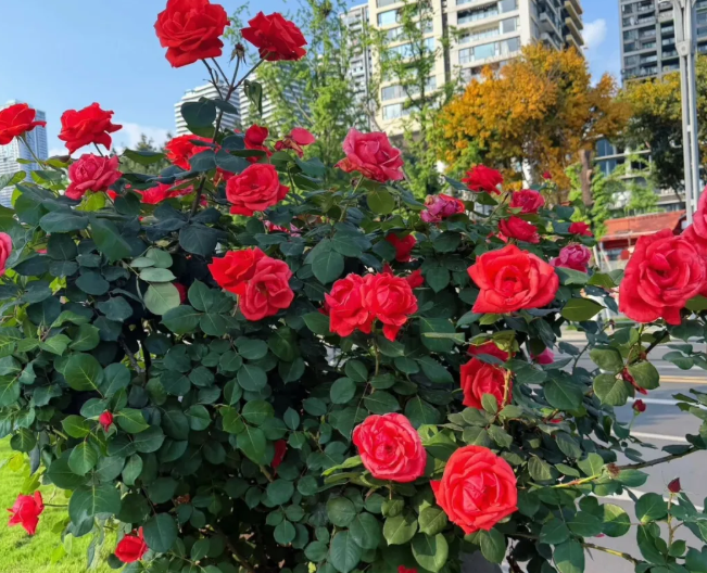 过玄坛庙,步入上层步道 步道旁的树状月季 进入了最佳观赏期 一朵朵又大又艳的月季花 在阳光下格外娇艳 让人心动不已