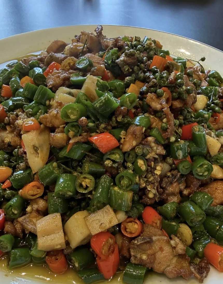作为玉峰山的“元老级”选手花椒鸡就是保持着一贯的水准!青花椒的麻与辣椒的辣度融合,鸡肉不柴,一鸡多吃!
