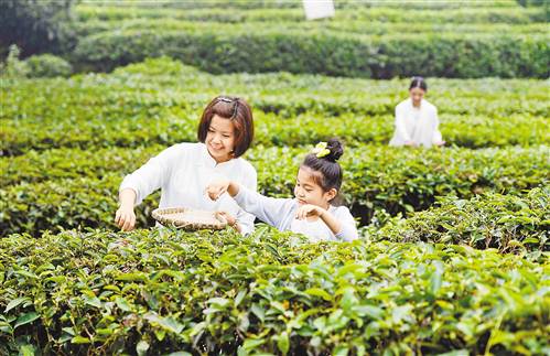 6月1日,在位于巴南区樵坪山风景区的重报怡家人心巢小镇项目现场,来宾正在体验采茶。