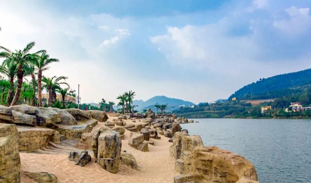 车从万盛城区出发往青年镇行驶,随畅通平整的农村公路一路前行,车行至岔路口,可见公路旁屹立着一块写有“板辽金沙滩”的标志牌,往标志牌指示的方向行驶2公里,便可见碧绿的板辽湖徜徉在连绵起伏的群山之中,转过一个弯,金黄色的沙滩映入眼帘:这里便是目前国内最具特色的内陆沙滩——板辽金沙滩。
