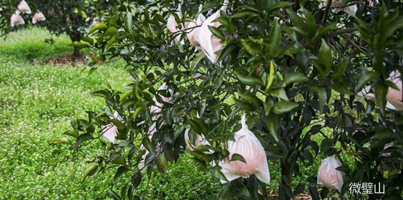 耙耙柑的每个果实上都套了一个个保护罩,老板说是没有打农药,非常的生态健康。