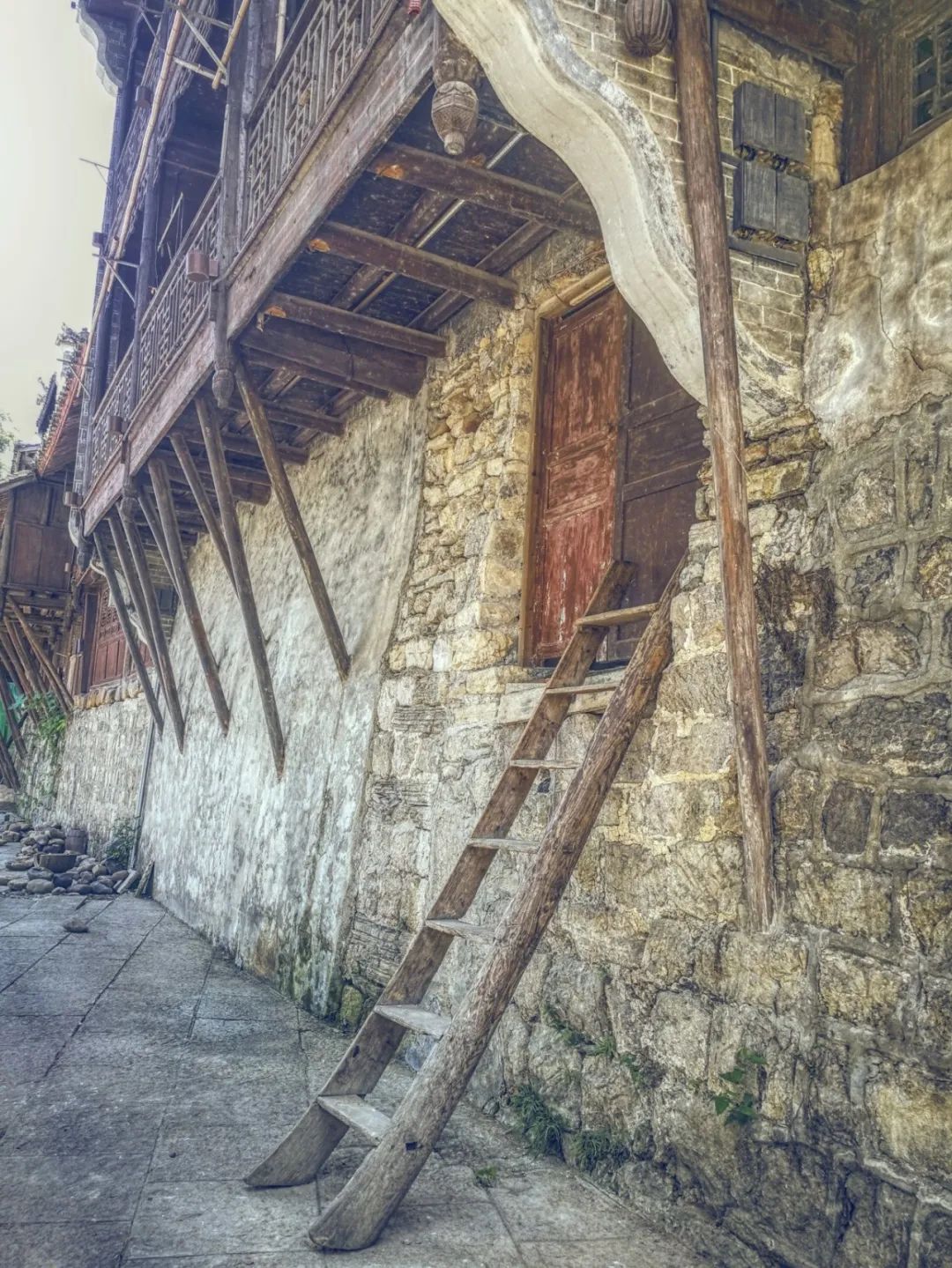 由于房门也很高,每一家门口都备有木梯,需要出门时就把梯子放下来,平常梯子是放在屋内的。