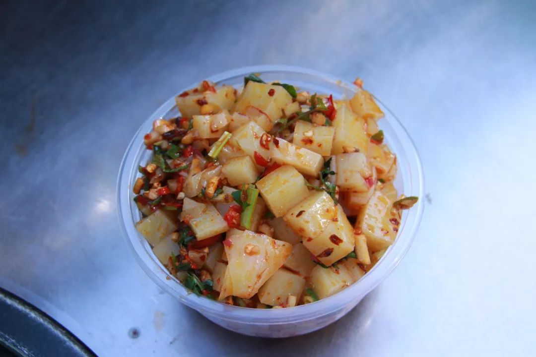 吃的时候将粉放入沸水中烫熟,拌以辣鸡、肉末、脆哨等佐料即可,麻辣鲜美,是当地人必吃的早餐之一。