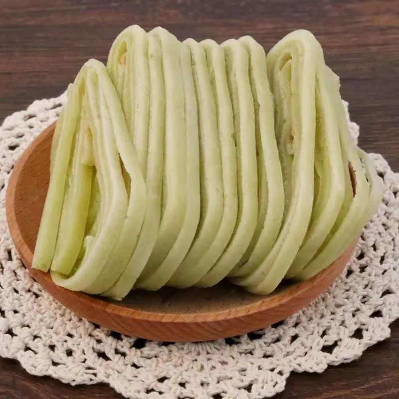 绿豆粉是把米绿豆和青菜叶一同磨好的浆,舀入铁锅中烙熟,两面均成锅粑状成型后收藏起来。