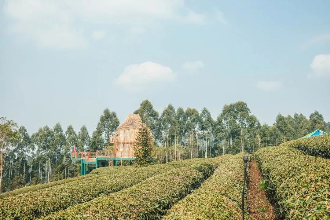 童话树屋掩映在青山绿水间翠绿的茶林风光吸引着无数游人